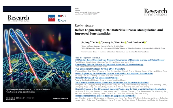 [Southeast University News Network, Aug. 3] (Correspondents: Zhao Han, Liu Zhongwen, Jiang Jie) Recently, Prof. Sun Litao and Prof. Ni Zhenhua from the research team concerning precise construction of two-dimensional materials, ranked among SEU’s top 10 scientific and technical issues, published a review paper titled “Defect Engineering in 2D Materials: Precise Manipulation and Improved Functionalities” in Research, an international high-level comprehensive journal. This paper was also selected as the cover paper of the special issue of “Nanofabrication of 1-2D Materials & Devices”.